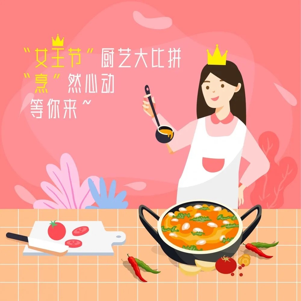 “女王节”厨艺大比拼 “烹”然心动 等你来~ 2020-03-03 春暖花开 一年一度的“女王节”又要到了 还记得去年 我们一起健步走在东湖绿道 笑语欢歌不断 然而,今年的疫情, 阻挡了我们出行的步伐 but!!! 女神宅家也一样过节! 在最近的一个多月里 当宅一度成为朋友圈热词 各式小仙女纷纷化身美丽俏厨娘 各种让人垂涎欲滴的美食在刷屏 各位隐藏“厨神”高光时刻频现 焖蒸炖煮,煎烤烹炸 从手工蛋糕,到DIY披萨 油条,曲奇,炸鸡,薯条,豆腐脑。。。。。。。。。 这么多的美食怎能只 MORE