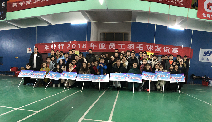 永业行组织开展2018年度员工羽毛球友谊赛 2019-01-27   为进一步丰富公司员工业余文化生活,搭建职工互动交流平台,营造和谐永业行氛围。2019年1月26日,永业行组织开展了“永业行2018年度员工羽毛球友谊赛”由省内外各部门组成的11支队伍、86名男女运动员参加了本次比赛。 本届赛制采用混合团体赛,共设混双1、混双2、混双3共三个项目,比赛先采取抽签分组的形式,第一阶段进行单循环赛,第二阶段采取交叉淘汰赛最终决出前3名。   在比赛中,选手们遵循友谊第一、比赛第二的原则,团结一致,奋力拼搏,现场对决紧张激烈,比赛精彩纷呈。赛场上,换上运动装的员工,变成了 MORE