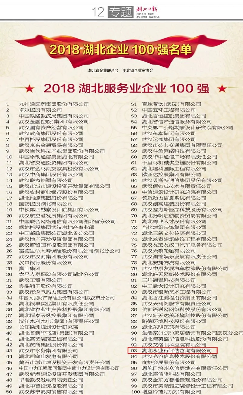 7月20日,湖北省企业联合会、湖北省企业家协会在汉向社会发布湖北企业100强,并首次推出湖北制造业企业100强、服务业企业100强。永业行荣登“2018湖北服务业企业100强”榜单,成为我省评估咨询行业唯一一家上榜企业。