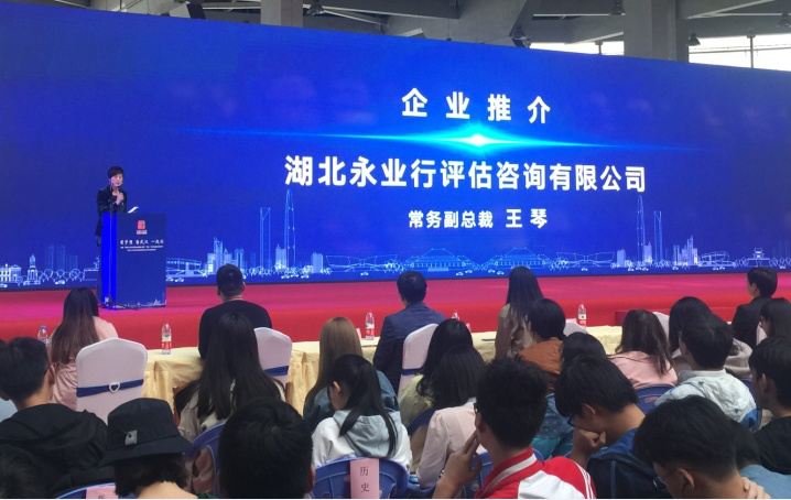 会议由胡太荣主持,李友祥在主题宣讲中详细介绍了武汉城市发展、留汉政策等;尚钢在开场致辞中诚挚祝愿广大毕业生能在将来的职业生涯中充分发挥自身才干,收获美好充实的人生;陈鹏在专题推介中向学子们发出了邀请,希望广大毕业生将青春梦想融于这座青年之城、梦想之城、创新之城、活力之城。永业行常务副总裁王琴作为企业代表上台进行了主题演讲,介绍了公司基本情况、业务领域和招聘相关要求,诚邀广大优秀学子加入永业行团队,携手共创“百年老店”。