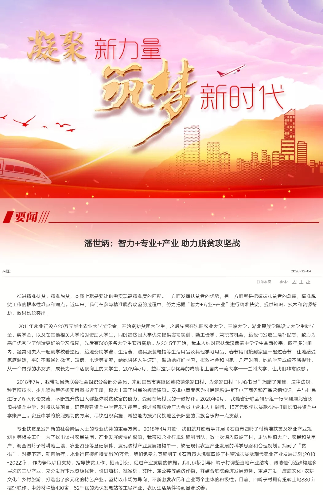 2020年12月4日,湖北省政协委员、省政府参事、永业行董事长潘世炳结合自身扶贫工作体会,撰写了《智力+专业+产业 助力脱贫攻坚战》,获中央统战部网站全文刊载。