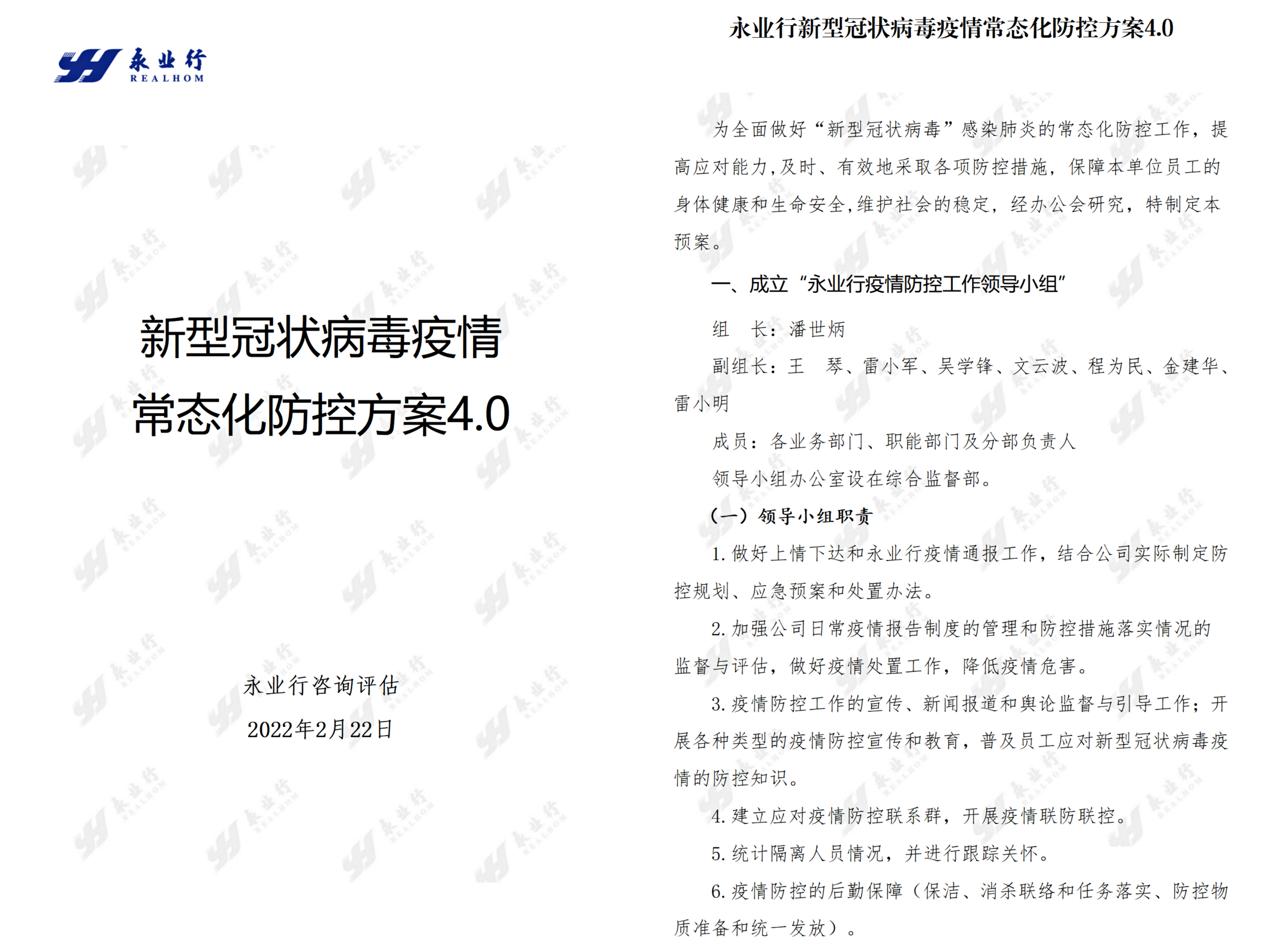 成立以永业行党委书记、董事长潘世炳为组长的疫情防控工作领导小组,召开疫情防控专题会议,制定《永业行新型冠状病毒疫情防控方案V4.0》《永业行疫情防控方案实施细则》等,对健康防护、场所消杀、办公制度、会议管理等工作再梳理、再完善、再部署,做到疫情防控有力有序。自2月22日起每日在线摸查员工健康安全情况,并对办公场所、员工宿舍所进行检查、消杀,切实保障员工身体健康和生命安全。