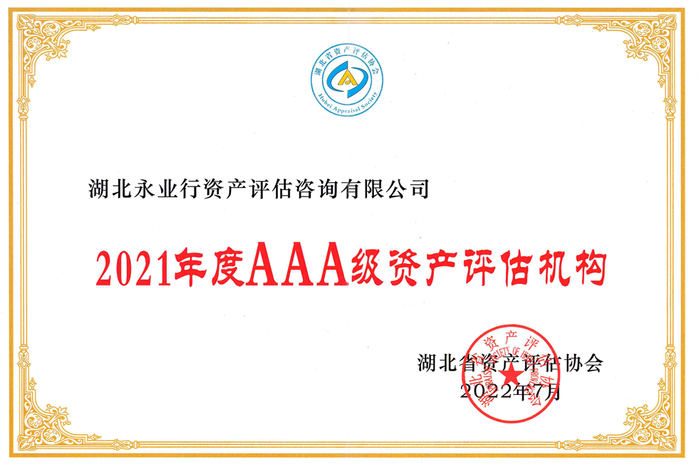 7月8日,湖北省资产评估协会发布《湖北省资产评估机构2021年度综合评价信息公告》,永业行以综合排名第三的成绩,连续十一年获评“年度AAA级资产评估机构”。