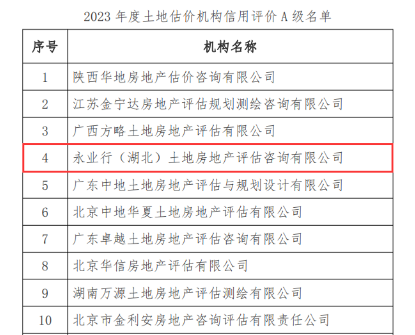 12月23日,中国土地估价师与土地登记代理人协会(下称“中估协”)发布“2023年度A级资信土地评估中介机构名单”,此次公布荣获A级资信的土地评估中介机构共120家。永业行位列全国第四、湖北第一,连续15年获评“土地估价机构信用评价A级”。