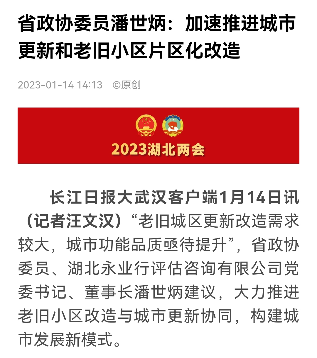 2023年1月,潘世炳向湖北省政协十三届一次会议提交了《老旧小区连片改造 推进城市更新升级》提案,获湖北日报、湖北卫视、湖北经视、长江日报、长江云等多家媒体报道。提案中指出,我省城建发展还存在一些不足,比如城市功能品质亟待提升、市政基础设施老化破损的改造需求较大、老旧城区更新改造需求较大、对市场化资金撬动力度需加强。提案建议从加速推进城市更新和老旧小区片区化改造、引导多主体协同推进、打通项目多元化资金筹措渠道等方面着手,大力推进老旧小区改造与城市更新协同,构建城市发展新模式。