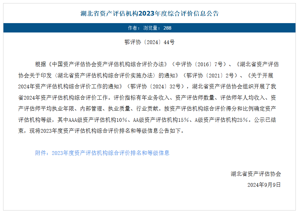 2024年9月9日,湖北省资产评估协会发布2023年度湖北省资产评估机构综合评价榜单,永业行凭借卓越的服务质量和执业水平,荣膺“AAA级资产评估机构”,位列湖北第一