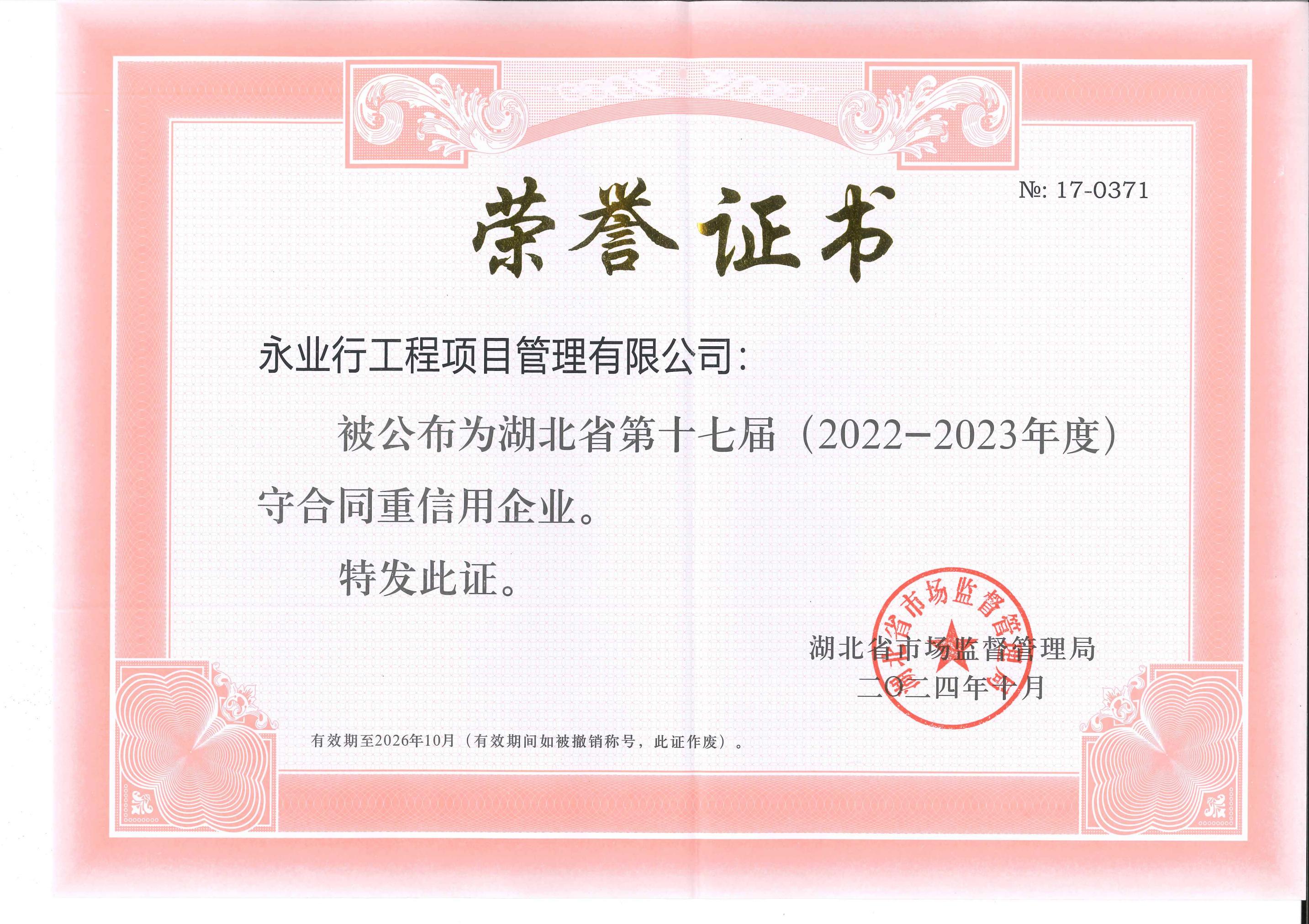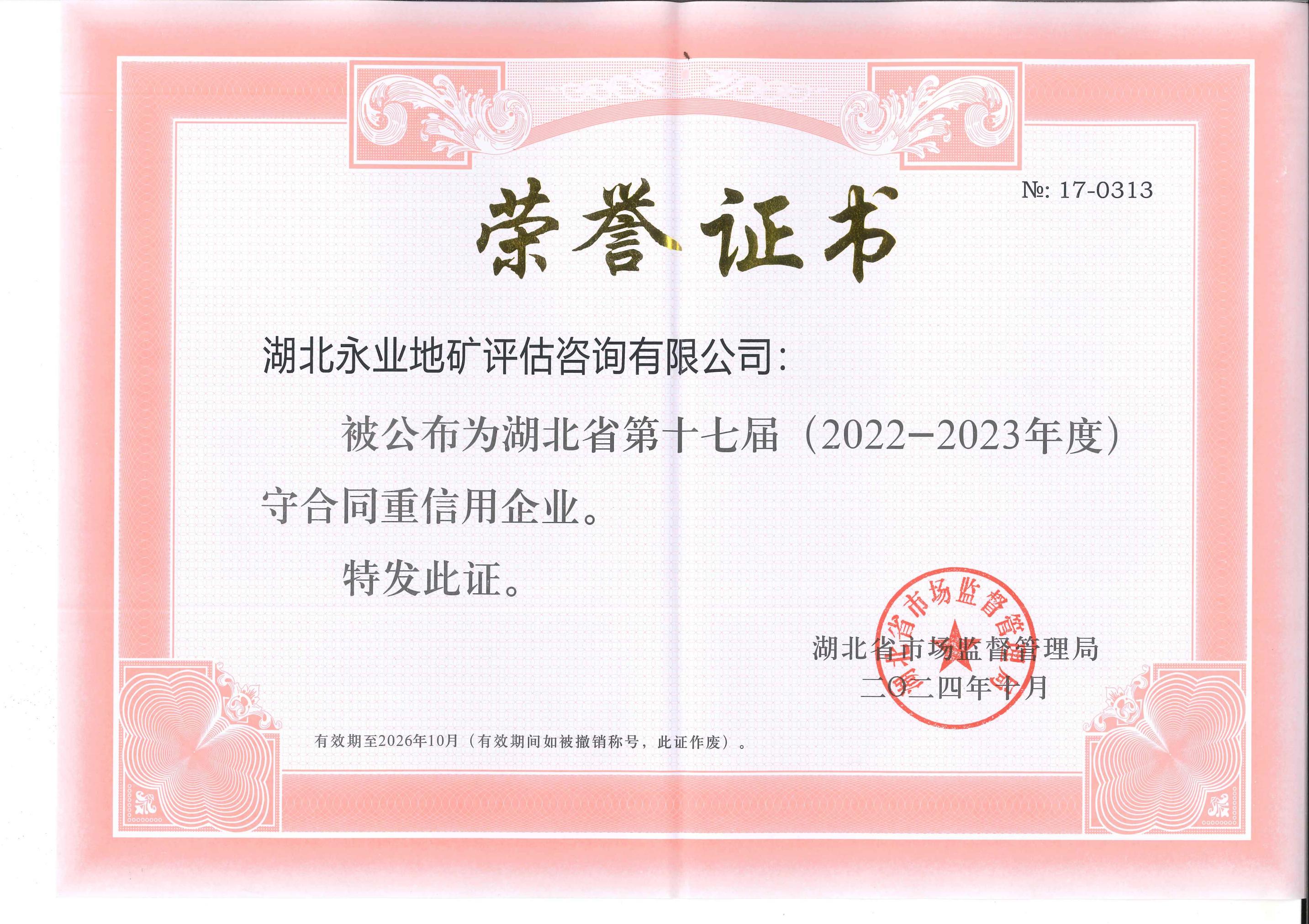 2024年10月21日,湖北省市场监督管理局公布了湖北省第十七届 (2022—2023年度)“守合同重信用”企业名单。成员机构湖北永业地矿评估咨询有限公司、永业行工程项目管理有限公司榜上有名,连续十三年获评湖北省“守合同重信用企业”。