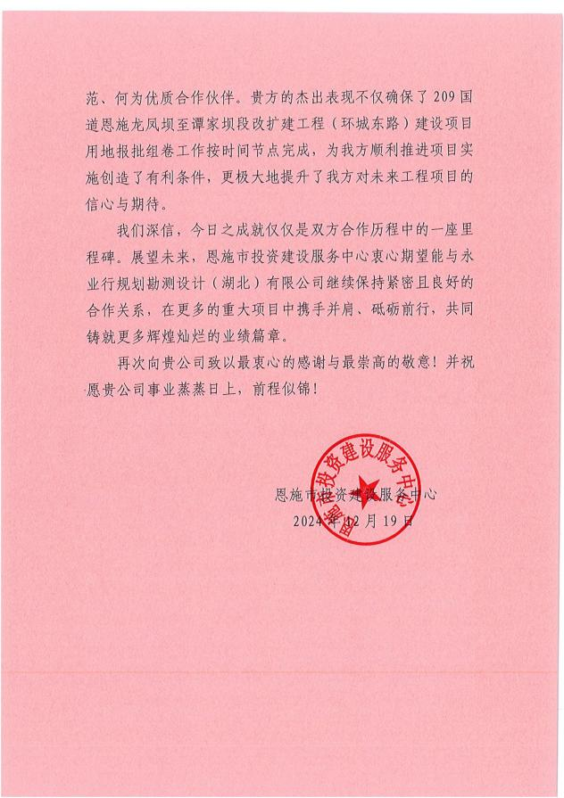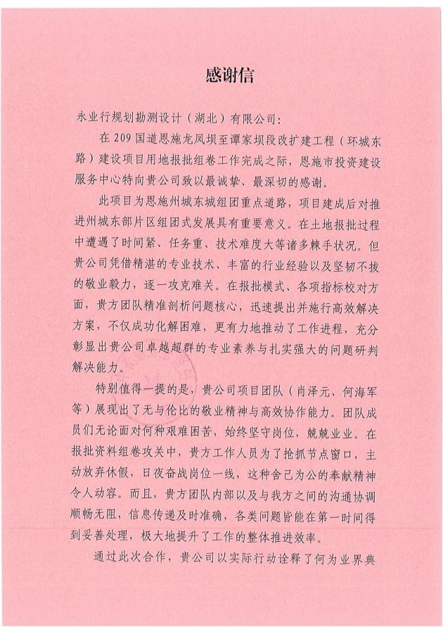 感谢信中对永业行鄂西区承担209国道恩施龙凤坝至谭家坝段改扩建工程(环城东路)表达了充分的感谢,赞许了项目团队(肖泽元、何海军)在面临土地报批时遇到时间紧、任务重、技术难度大等问题时,始终坚守岗位、兢兢业业,为抢抓节点窗口,主动放弃休假,日夜奋战岗位一线,展现出无与伦比的敬业精神和高效协作能力,团队内部以及与各方之间的沟通协调顺畅无阻,信息传递及时准确,确保了问题在第一时间得到妥善处理,大大提高了工作效率,最终确保项目用地报批组卷工作按时完成,为项目的顺利实施创造了有利条件。