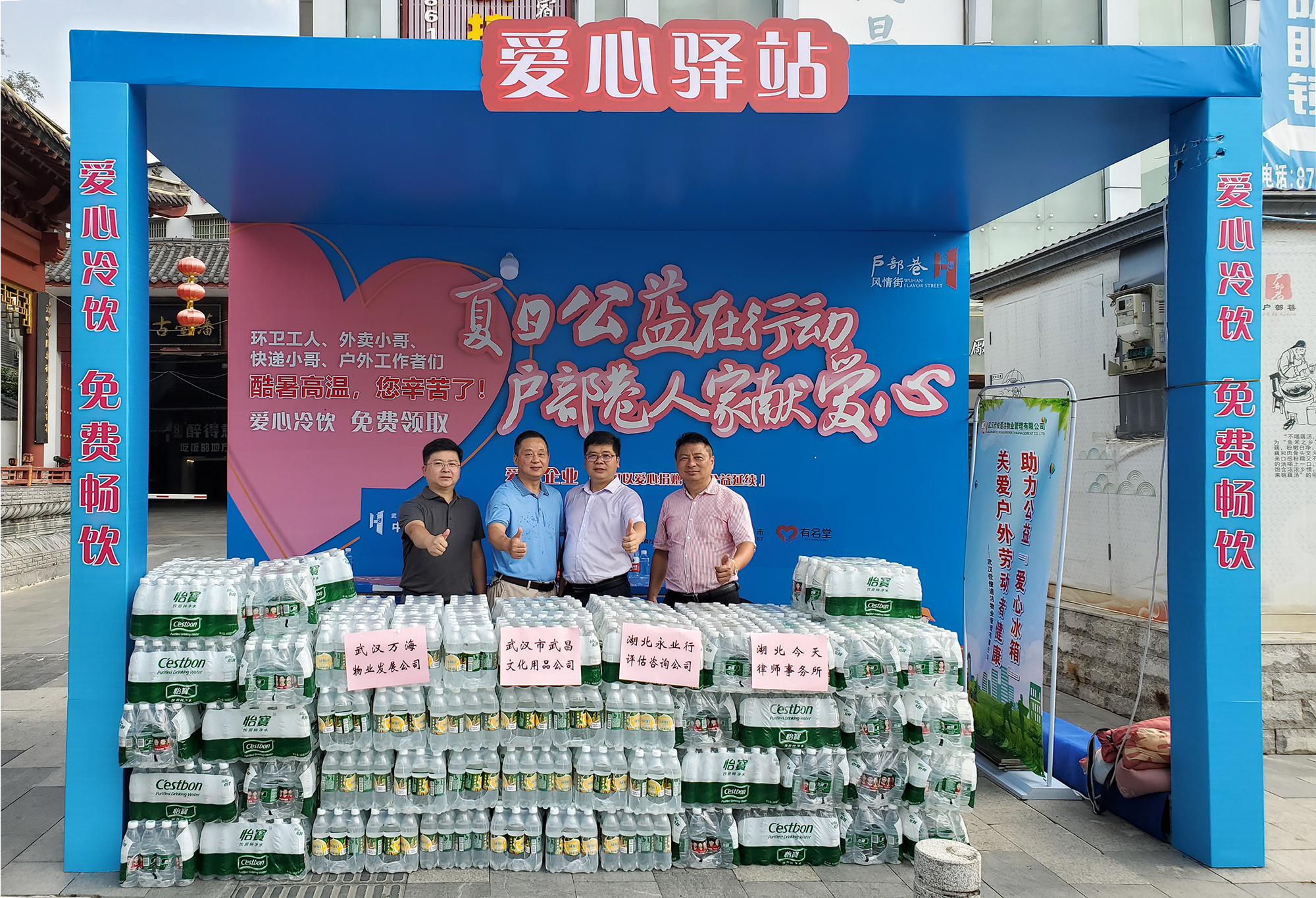 2022年8月17日上午,由武汉市武昌区企业联合会发起,永业行等数家企业向位于户部巷的爱心驿站捐赠了批量矿泉水、汽水等防暑降温物资,区企业联合会会长黄诚泽,区企业联合会副会长兼秘书长、永业行副总裁雷小军等参加捐赠活动。