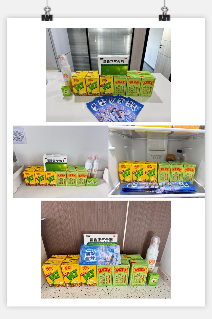 渴了来杯凉茶爽口~对抗户外高温不能没有防晒~午后犯困就找风油精提神~还有藿香正气水和降温冰贴,外出回来急速消暑降温。只为清凉一夏,健康工作,活力满满,守护员工的每一个日常时刻。